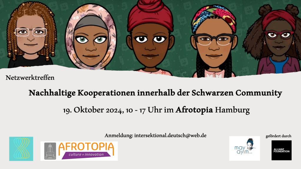 Im Jahr 2024 haben wir die Möglichkeit, die Initiative durch die Förderung des May Ayim Fonds innerhalb der Schwarzen Community zu platzieren. Durch Netzwerk- und ThinkTank-Veranstaltungen im Juli und Oktober 2024, welche den Auftakt für weitere Kooperationen mit dem Afrotopia Hamburg und anderen Initiativen, Organisationen, Vereinen und Einzelakteur*innen der Schwarzen Community bilden, nähern wir uns der Frage, wie nachhaltige Kooperationen innerhalb der Schwarzen Community gelingen können.